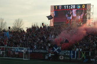 A celebratory smoke illustrating the home crowd’s great excitement at the debut of Jamaica’s Brian Brown, who scored for them in the 12th minute by punishing New York’s keeper. Here’s Indy Eleven’s game recap: Cosmos goalkeeper Jimmy Maurer wandered five yards out of his penalty area to head away a through ball, but his clearance made it only as far as Brown, as the Jamaican took a touch before looping a ball inside the right post and into the empty net from 30 yards out.