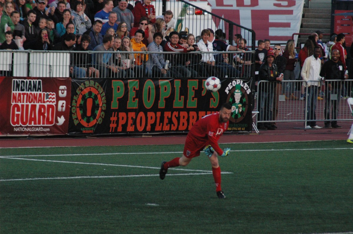 The German born and bred goalie Kristian Nicht distributes the ball during the first half. Nicht’s nimble net minding enabled Indy to withstand New York’s attacking barrage.