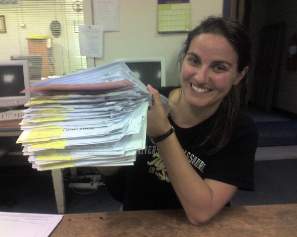 The stack of papers is the total data requests I fielded from newsrooms around the country the morning after the tragic I-35W bridge collapse in Minneapolis in which 13 people were killed and more than 100 injured. I was the sole employee on duty that morning at the National Institute for Computer-Assisted Reporting — plenty of helpers chipped in by the end of the day!